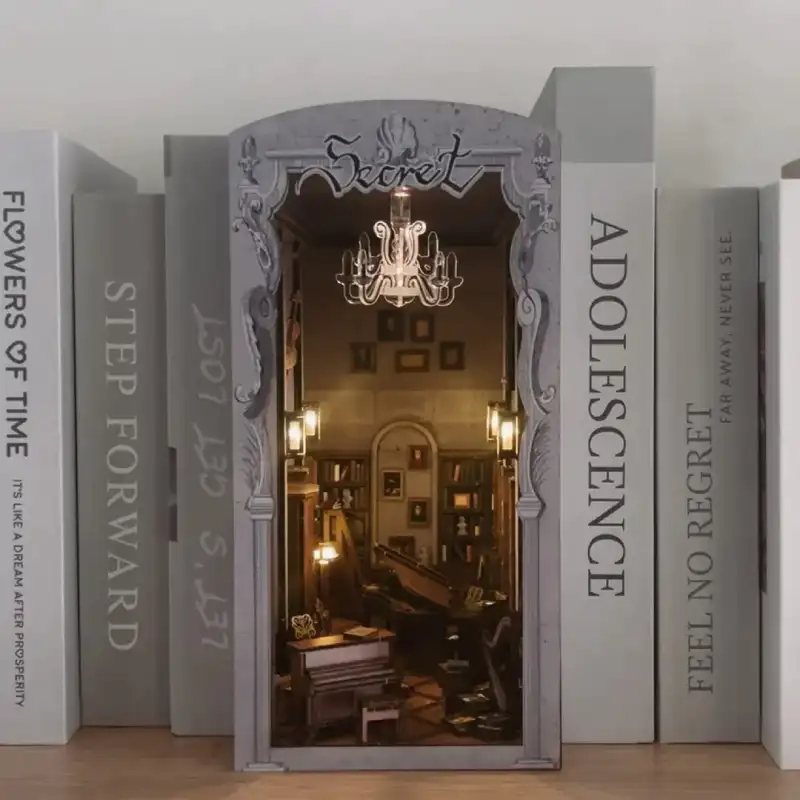 Le Book Nook Secret Piano Room, une ode à la musique et à la littérature, enfermée dans un diorama sublime. Imprégnez-vous de l'atmosphère d'une salle de musique intime, ornée d'un élégant piano et d'une bibliothèque bien garnie.